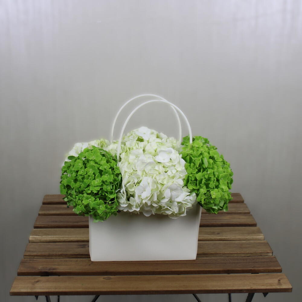Une composition rafraîchissante d'hortensias blancs et verts élégamment présentée dans un sac. Les fleurs blanches immaculées exhalent pureté et grâce, tandis que les hortensias verts éclatants apportent une touche vive du charme de la nature. Ensemble, elles créent un mélange harmonieux d'élégance et de fraîcheur, parfait pour toute occasion. Cette présentation élégante en fait un cadeau idéal ou un objet décoratif, apportant beauté et sophistication à tout espace grâce à son attrait intemporel.