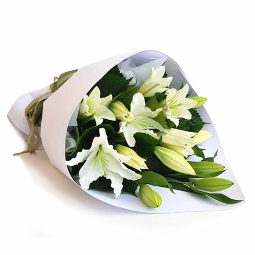 5 fleurs de lys blanches, à la livraison les boutons peuvent ne pas être ouverts, dans les 24 heures ils commenceront à s'ouvrir