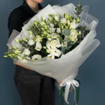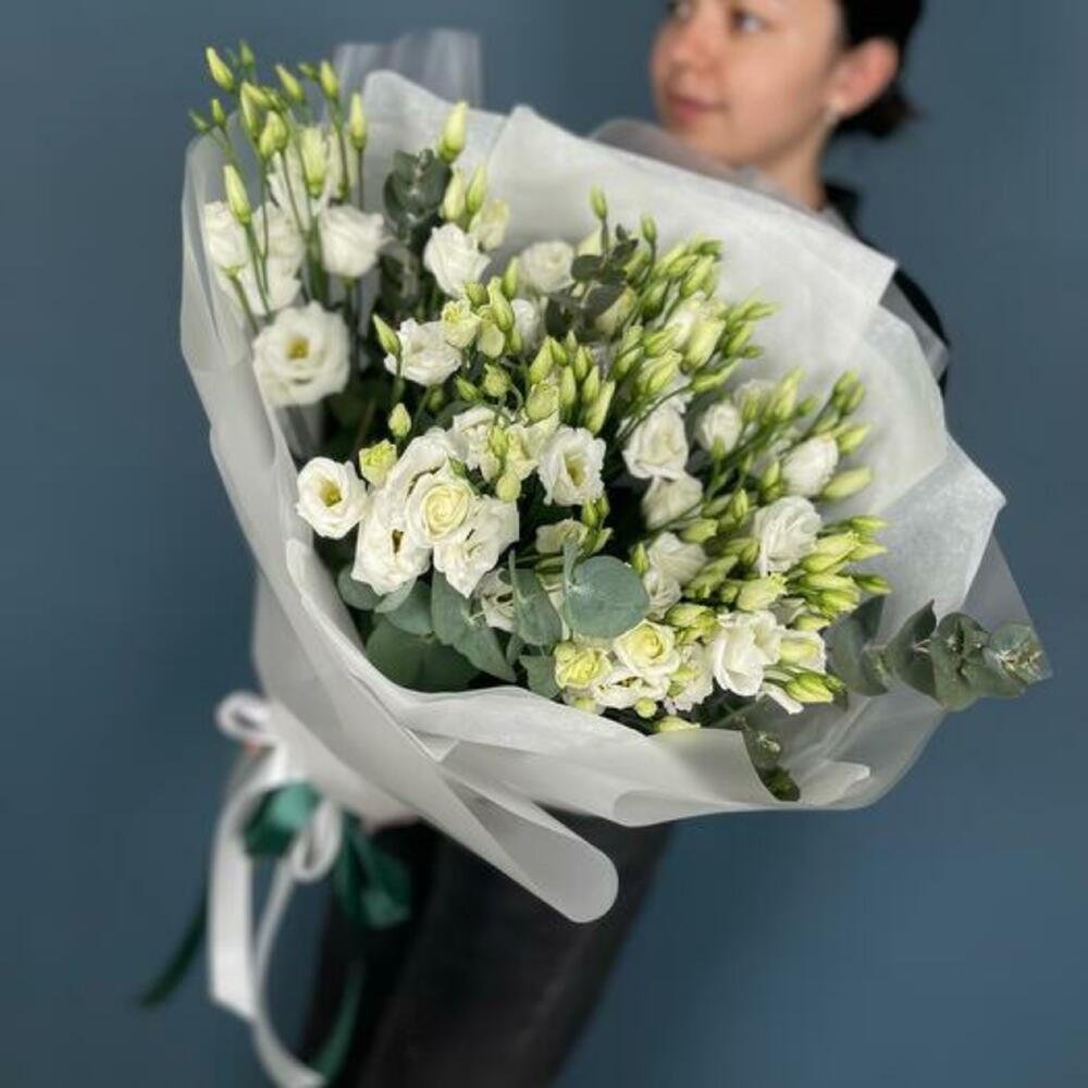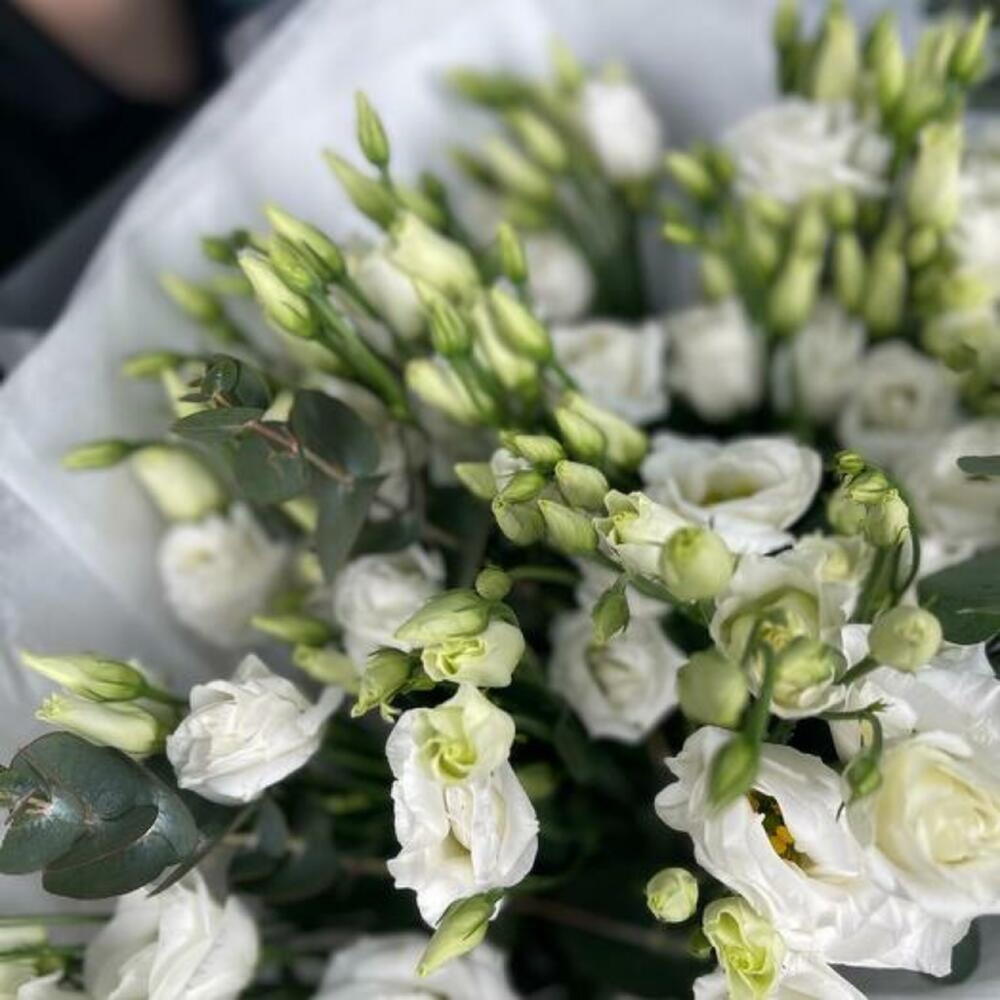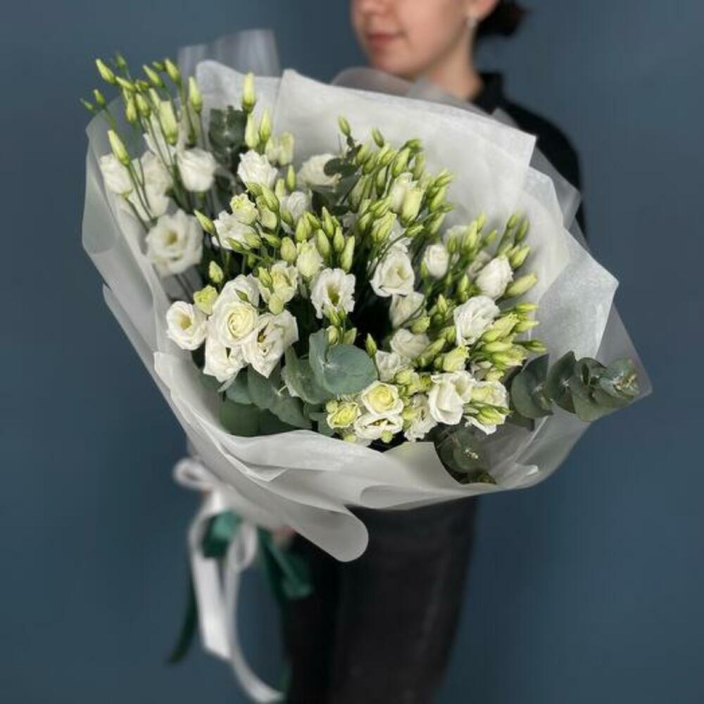 Eucalyptus - 5 pce Eustoma white - 11 pce ribbon satin - 1 pce emballage design - 1 pce