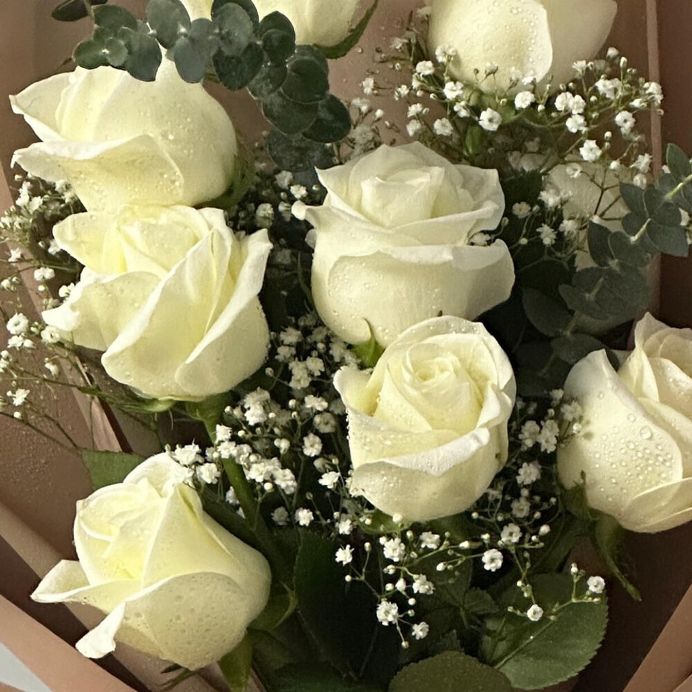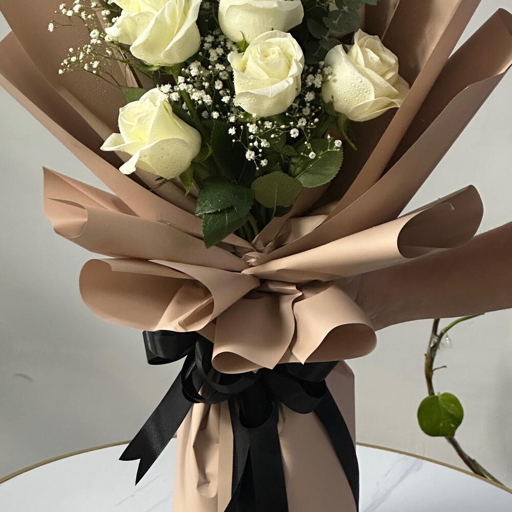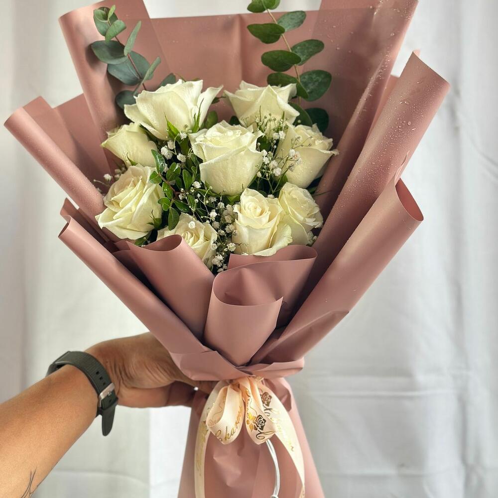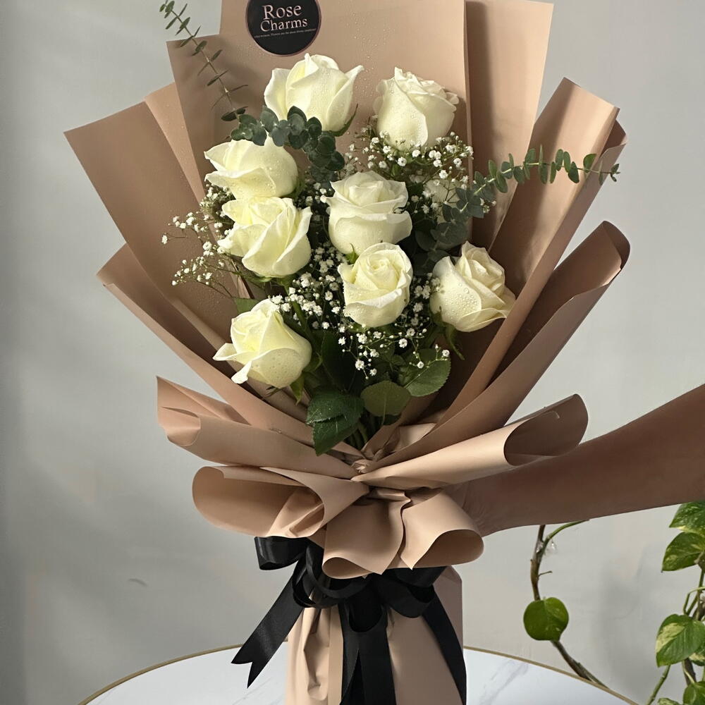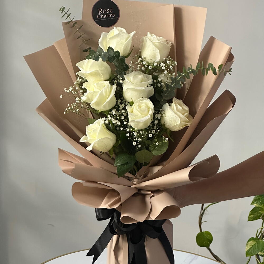Un bouquet classique et élégant de 9 roses blanches fraîches, magnifiquement disposées pour exprimer la pureté, la reconnaissance et l'émotion sincère. Enveloppé dans une finition douce et élégante, ce bouquet est parfait pour les fêtes d'anniversaire, les moments de remerciement, les anniversaires, les gestes de sympathie ou de simples surprises du quotidien. Comprend : ✓ 9 roses blanches de qualité supérieure ✓ Emballage élégant ✓ Finition avec ruban satiné ✓ Fait main par Rose Charms – JLT Un bouquet doux et intemporel qui laisse une impression gracieuse. “Commandez ce élégant bouquet blanc aujourd'hui — livraison le jour même.”
