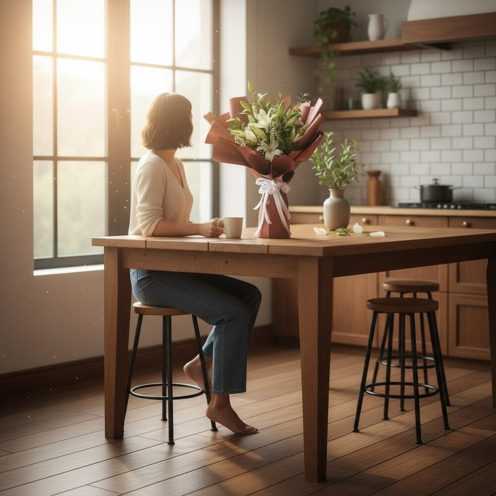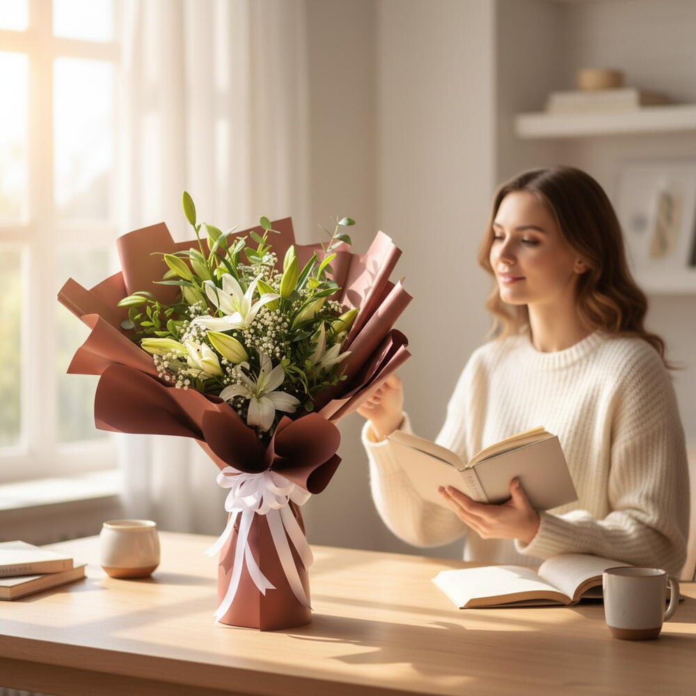 Voici un élégant bouquet composé de cinq superbes lys blancs encadrés par l'arôme terreux de l'eucalyptus. Tendrement enveloppée dans un papier de haute qualité, cette composition incarne le raffinement et la sophistication. Une offrande parfaite pour les occasions où vous souhaitez exprimer une affection pure, ou comme une pièce maîtresse attrayante pour la décoration de votre intérieur. Avec son charme intemporel, ce bouquet des Spécialités du fleuriste sublime votre expression d'amour, d'admiration ou même de consolation.