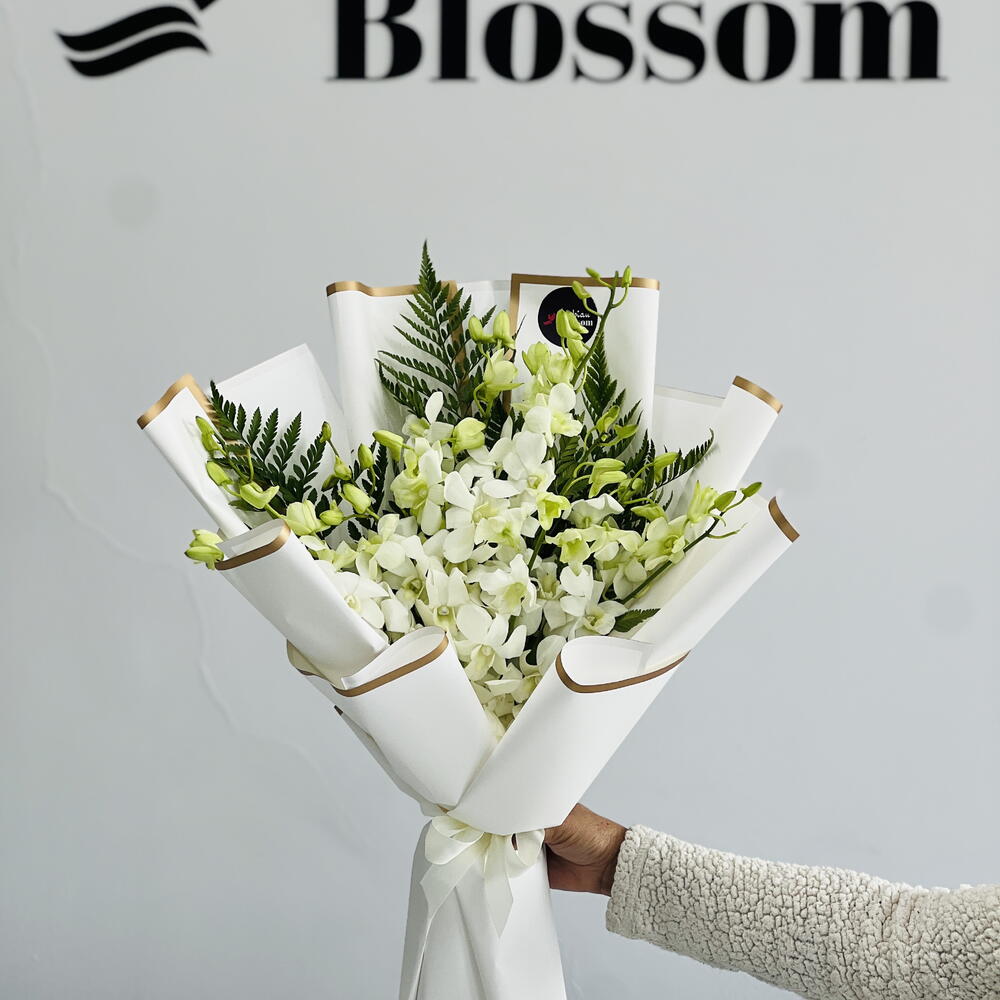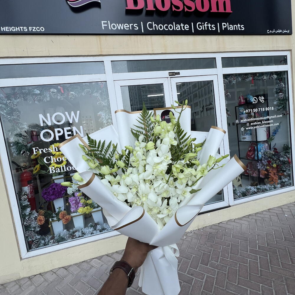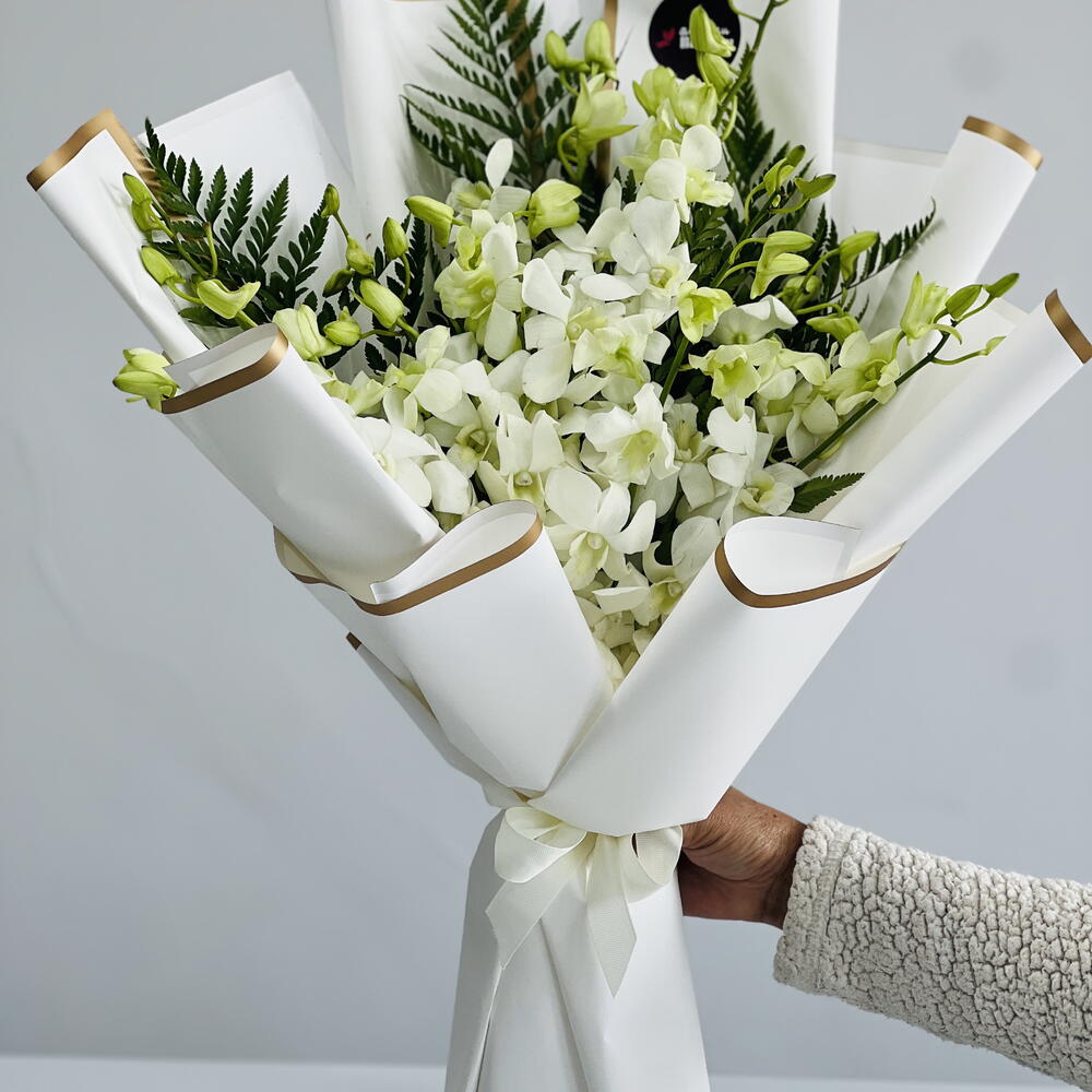 Bouquet de 10 tiges d'orchidées dendrobium blanches dans un bel emballage