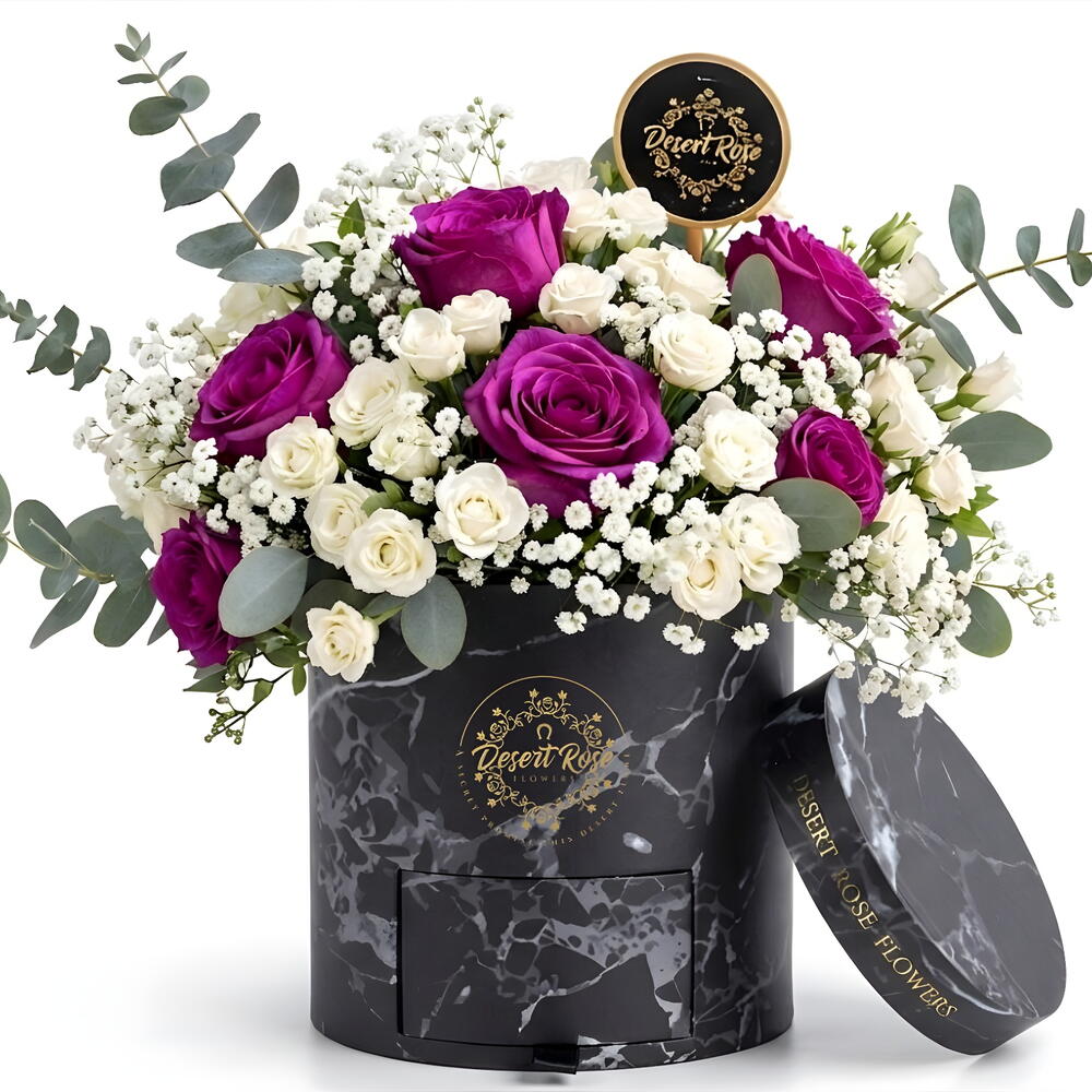 A beautiful arrangement presented in our signature black drawer box, featuring 10 purple roses and 10 white baby roses, complemented with delicate gypsophila (baby’s breath) and fresh eucalyptus leaves. This elegant combination creates a charming and thoughtful gift for any special occasion.