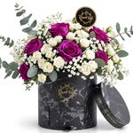 Eucalyptus - 3 pce Gypsophila - 4 pce roses violettes - 10 pce mini-roses blanches - 10 pce black marble design box - 1 pce