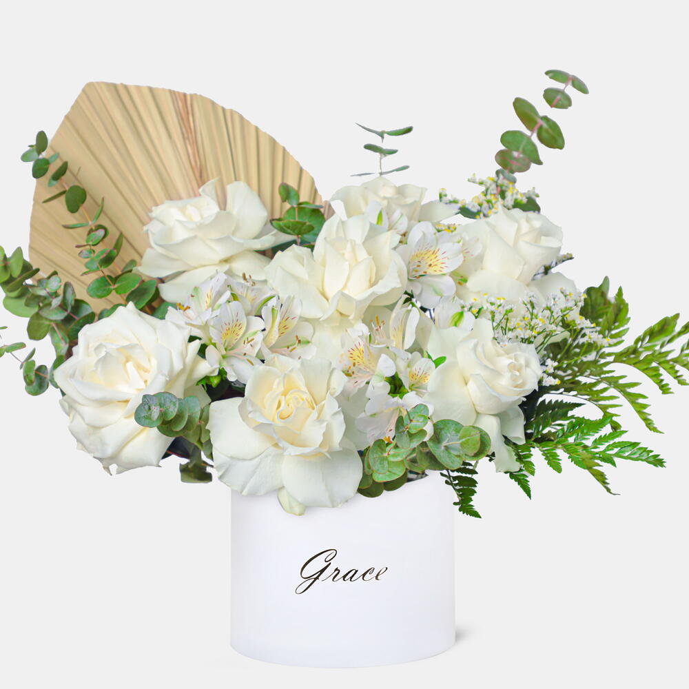 Greenery - 4 pce Limonium - 2 pce Alstroemeria - 2 pce feuille de palmier - 1 pce roses blanches - 7 pce