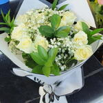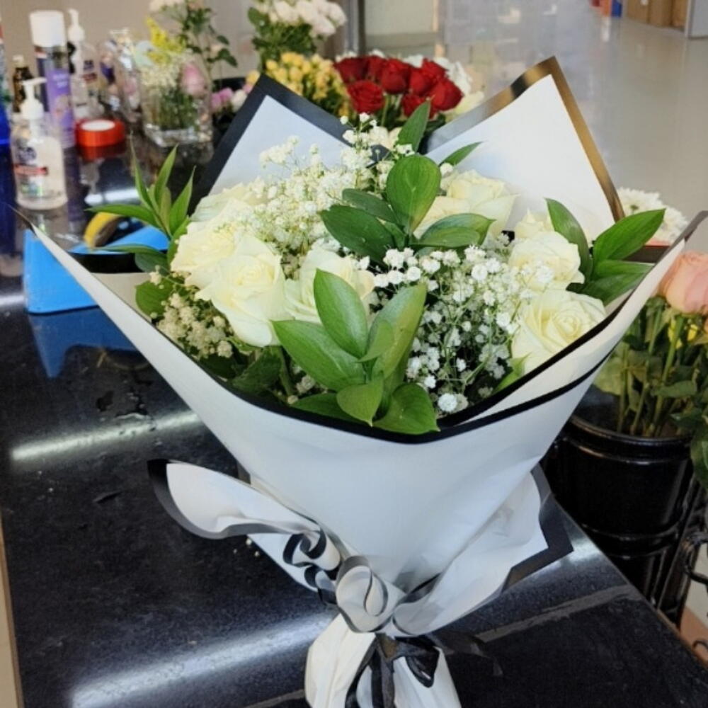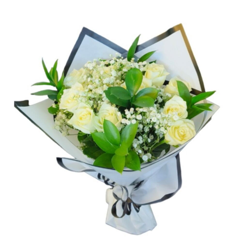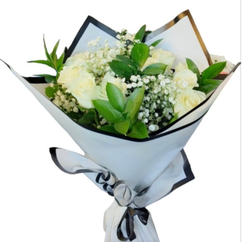 Magnifiques 10 roses blanches avec garniture saisonnière et emballage en papier blanc