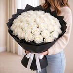 Ce bouquet présente un grand nombre de roses blanches de qualité supérieure, soigneusement disposées en forme de dôme pour un aspect plein et impressionnant. 50 roses blanches premium grande taille Contient une généreuse quantité de roses rouges fraîches pour un aspect dense et luxueux en 1 couleur Enveloppé dans un papier noir épais multicouche qui renforce le volume et l'impact du bouquet.