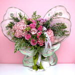 Déployez la beauté de notre bouquet de fleurs style papillon ! Cet arrangement fantaisiste présente des pétales délicats et des couleurs douces, soigneusement conçu pour ressembler aux ailes d'un papillon. Un mélange éblouissant d'hortensias roses, de santhini roses, de roses, de roses spray, de lisianthus roses et d'eucalyptus conçu pour répandre la joie et ajouter une touche d'élégance à toute occasion.