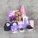 1 Purple Forever Rose in Black Box, Womens Day Premium Assorted Chocolates By Sweecho 16 Pcs, 1 Cute Soft Toy 30cm, 1 Blueberry Loaf Cake, Premium Blueberry Macarons 5 Pcs, 1 XL Chocolate Cookies 80gm, 1 Scented Pillar Candle, Arranged in a Acrylic Purple Tray