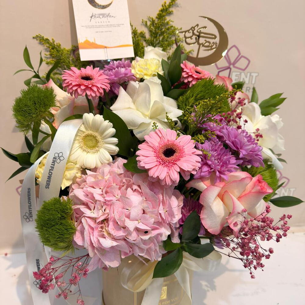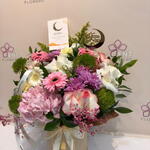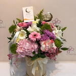 White rose - 3 pce Cloche verte - 4 pce gérbera rose - 3 pce gypsophile - 4 pce hortensia rose - 1 pce rose rose pâle - 3 pce biscottes - 4 pce chrysanthème violet - 2 pce gerbera baige - 2 pce baige box - 1 pce