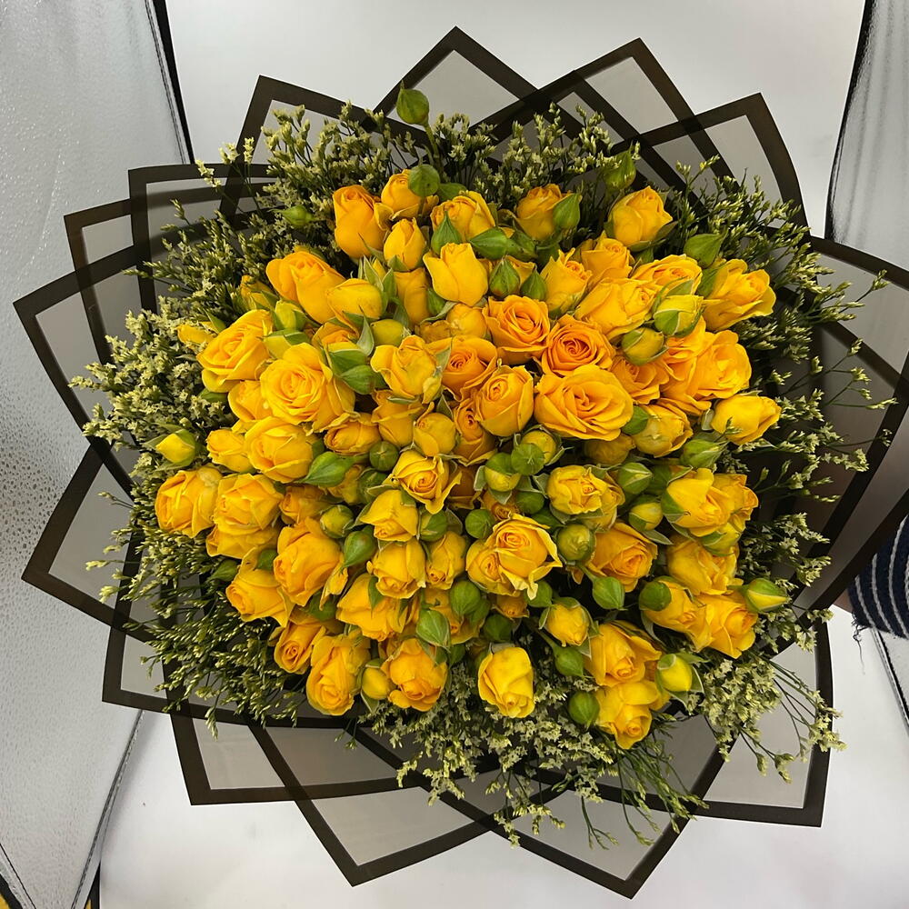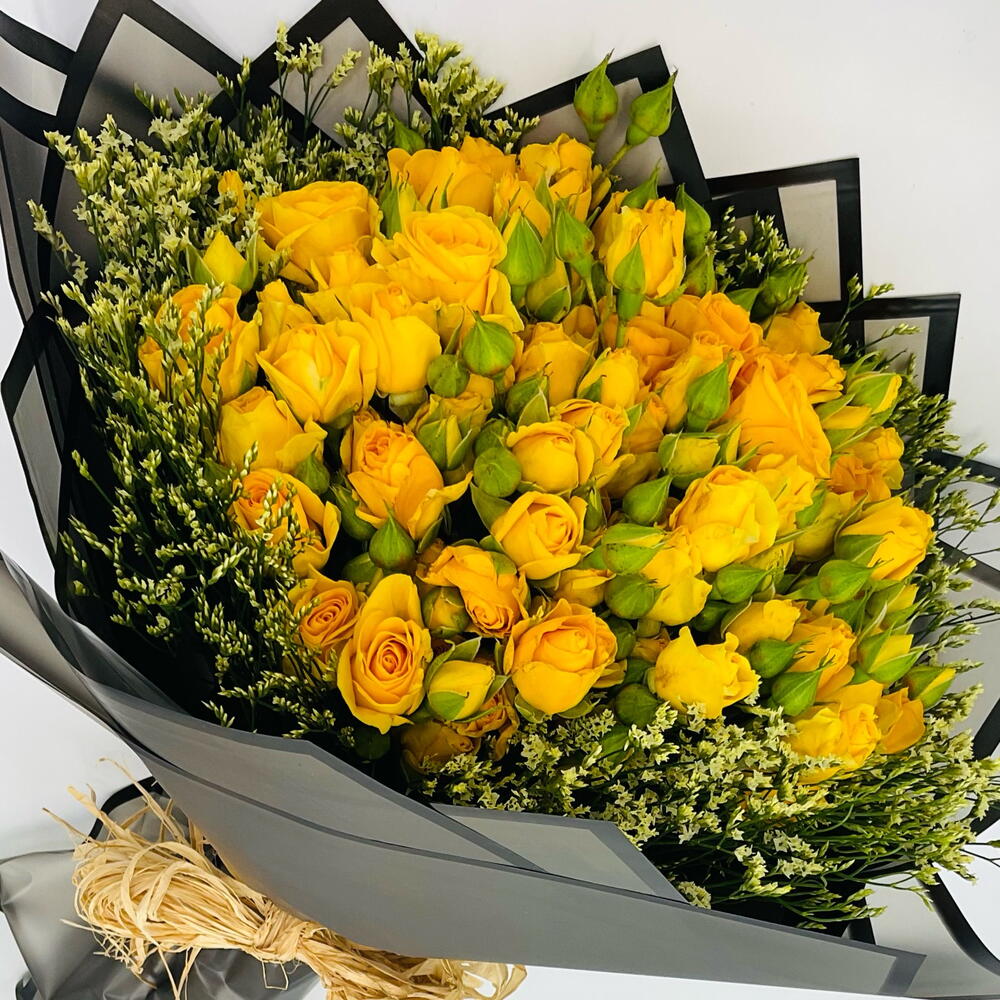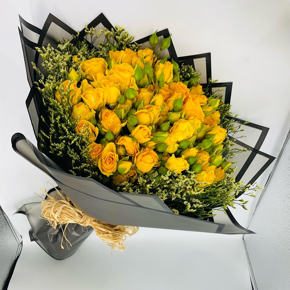 Ribbon - 2 pce Limonium - 6 pce spray de roses jaunes - 30 pce wrapping paper - 5 pce