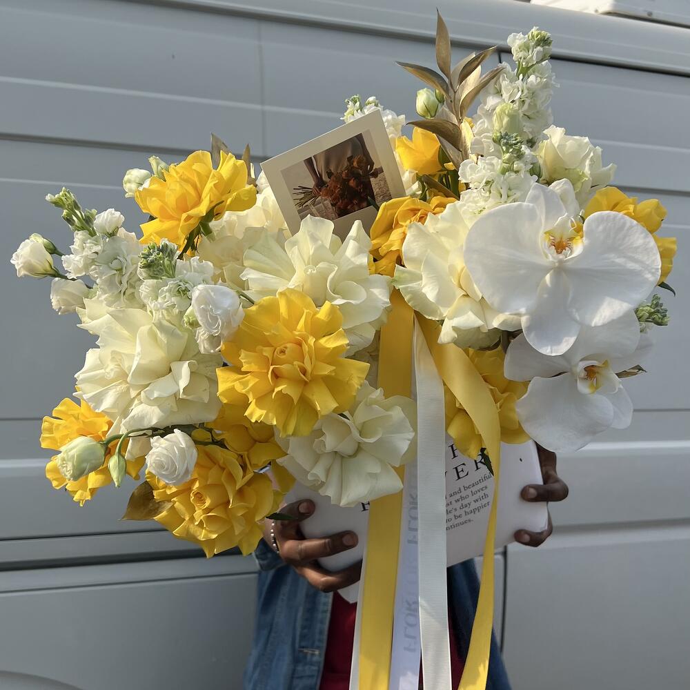 Ruscus - 5 pce Hydrangea - 1 pce Orchidée - 2 pce rose - 30 pce mattiola - 3 pce