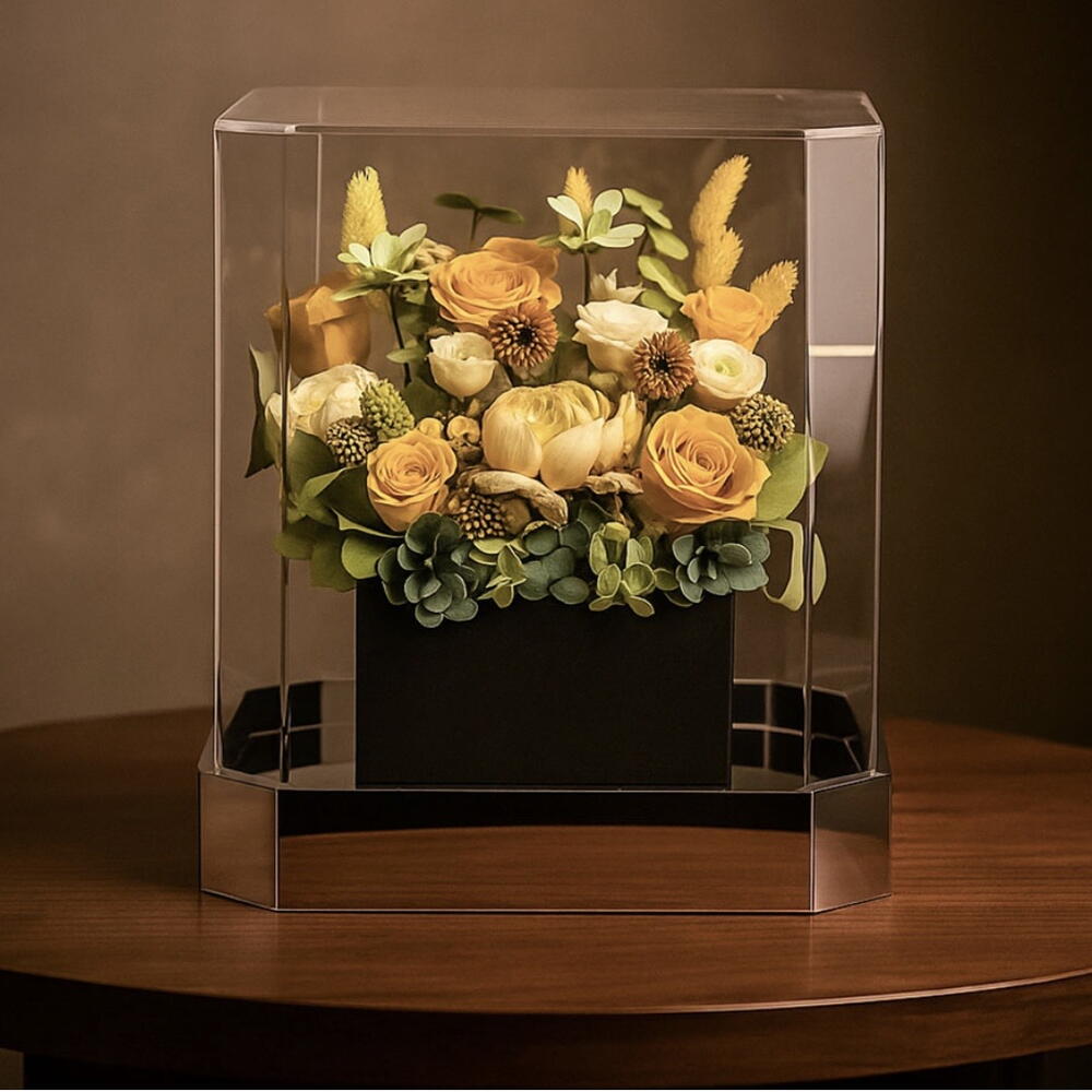 Dôme en verre de haute qualité avec plusieurs fleurs naturelles préservées dans un dôme en verre pour toujours