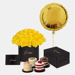 Illuminez la journée de quelqu'un avec nos roses jaunes en boîte, accompagnées d'un délicieux mini-gâteau de 4 pièces et de ballons joyeux, pour un cadeau de fête parfait. Parfums Mini-gâteau : Ferrero, Red Velvet, Pistache, Lotus