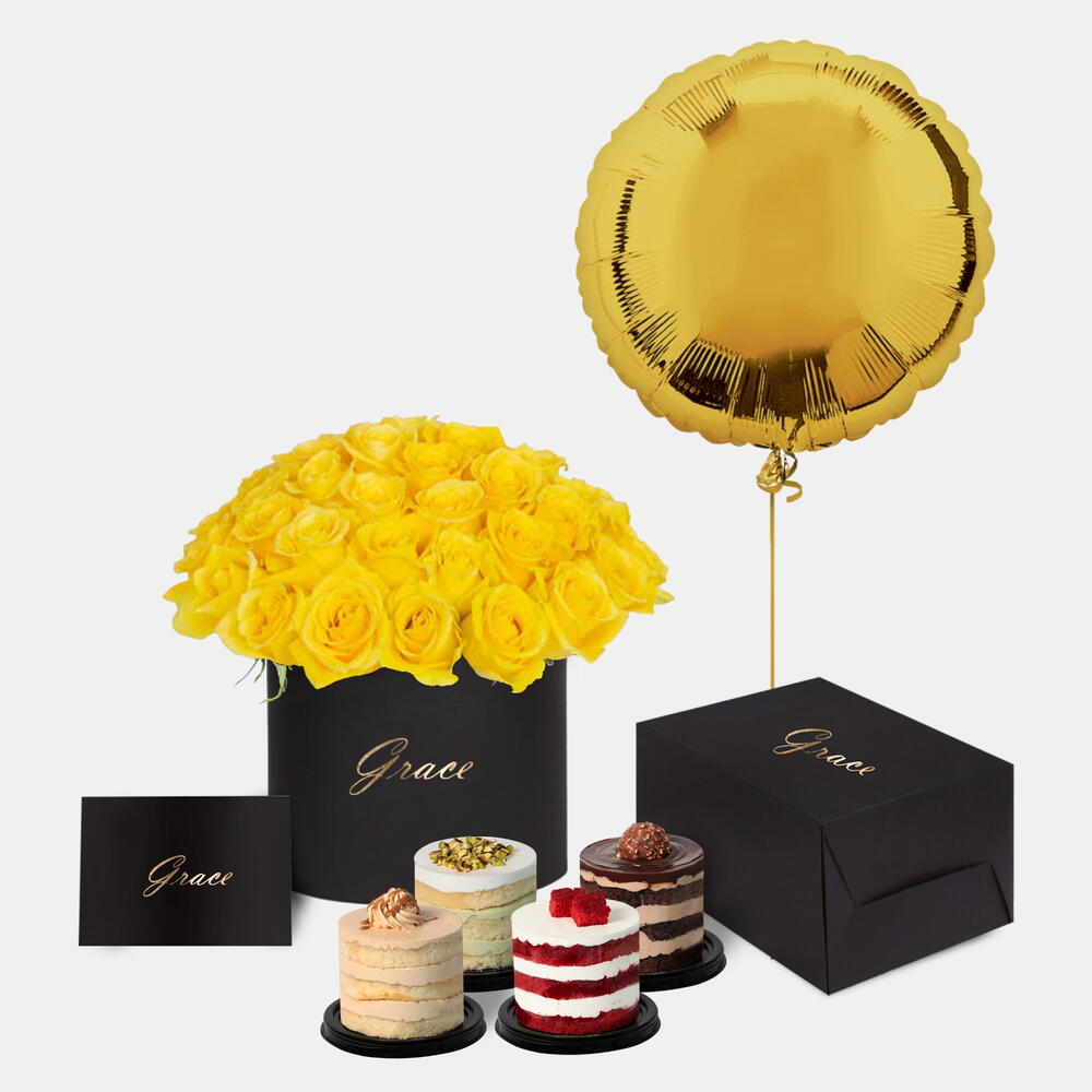 Roses jaunes en boîte avec mini-gâteau et ballons