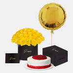 Notre coffret de roses jaunes en boîte avec gâteau rayonne de bonheur et de chaleur, mettant en vedette de vives roses jaunes parfaitement associées à un délicieux gâteau pour célébrer des moments joyeux.