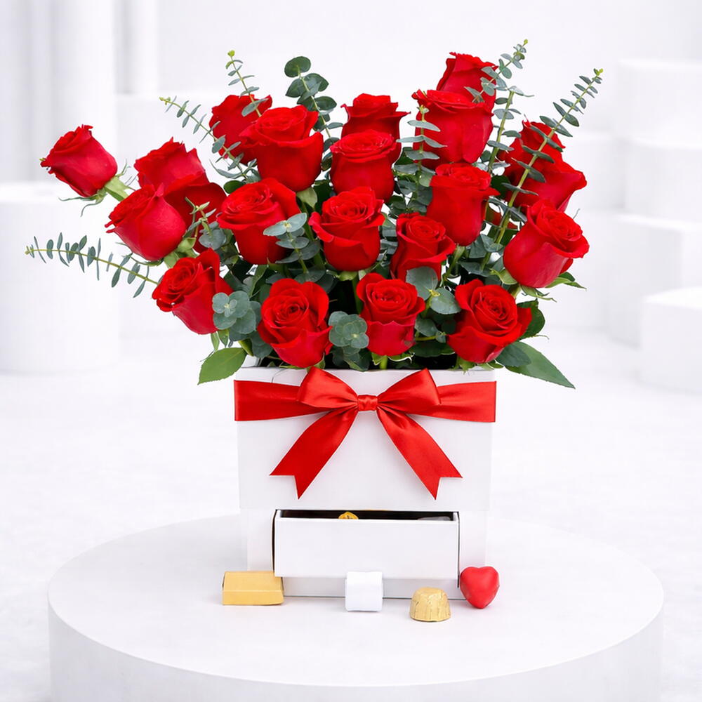 Chocolats Premium Favish 100 g 21 roses rouges Feuilles - 8 feuilles d'eucalyptus Arrangé dans une boîte carrée blanche