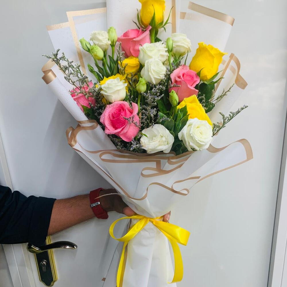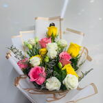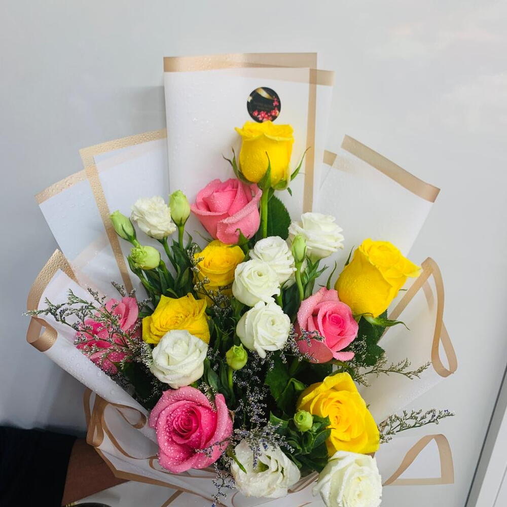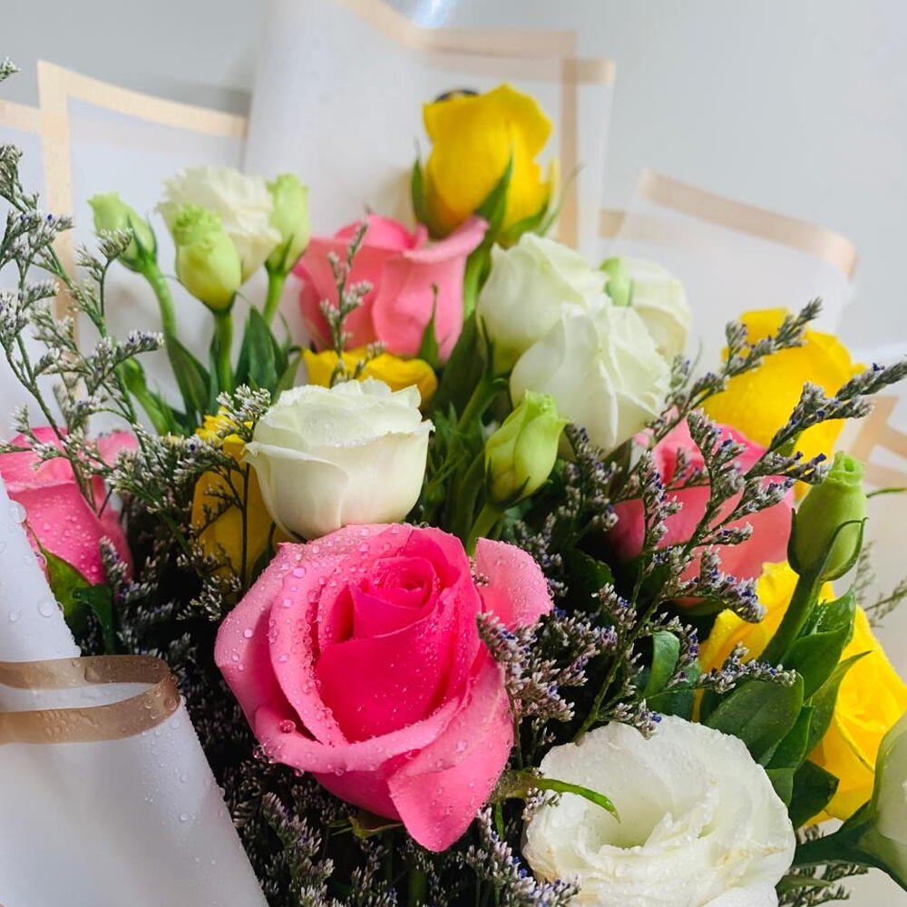 Limonium - 3 pce Yellow rose - 5 pce lisianthus white - 5 pce jumelia rose rose - 4 pce