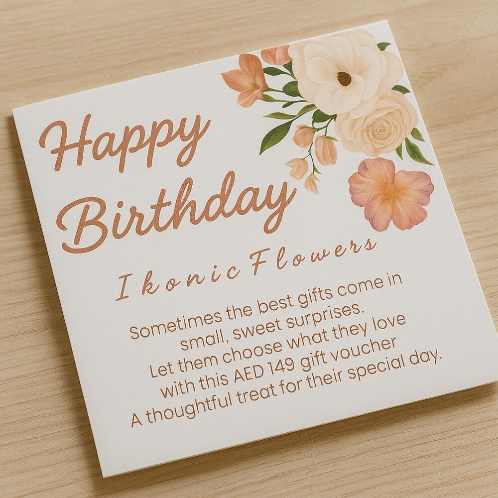🎁 Bon cadeau d'anniversaire AED 149 🎁 Rendez le jour spécial de quelqu'un encore plus lumineux avec notre bon cadeau numérique exclusif AED 149 ! Ce bon est la surprise d'anniversaire parfaite — il permet à votre proche de choisir ce qu'il souhaite dans notre boutique, jusqu'à AED 149. 💡 Comment ça marche : Il s'agit d'un bon numérique, délivré instantanément. Le bénéficiaire peut l'échanger contre tout produit d'une valeur de AED 149 dans notre boutique. Au moment de l'achat, des frais de livraison peuvent s'appliquer, mais ne vous inquiétez pas — nous rembourserons les frais de livraison après la commande ! Offrez le choix et des fleurs fraîches avec notre magnifique bon cadeau d'anniversaire.