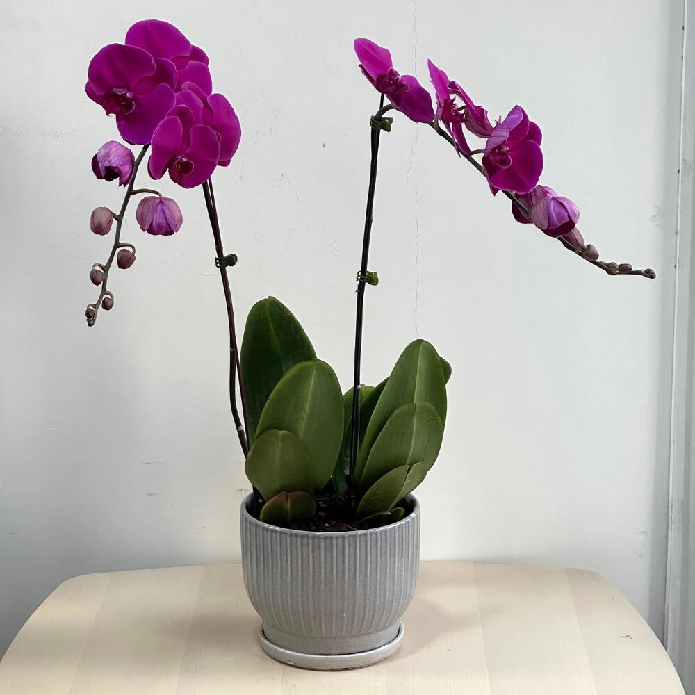 Invitez la beauté de la nature dans votre espace avec nos deux élégantes tiges d'orchidée Phalaenopsis rose, délicatement mises en pot pour embellir n'importe quel coin par leur charme intemporel