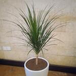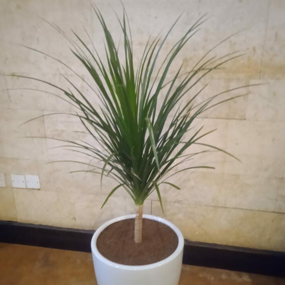 L'élément central est une plante Dracaena, caractérisée par ses longues feuilles vertes, fines et pointues qui s'épanouissent en éventail à partir d'une tige unique et dressée. Le feuillage semble sain et bien entretenu