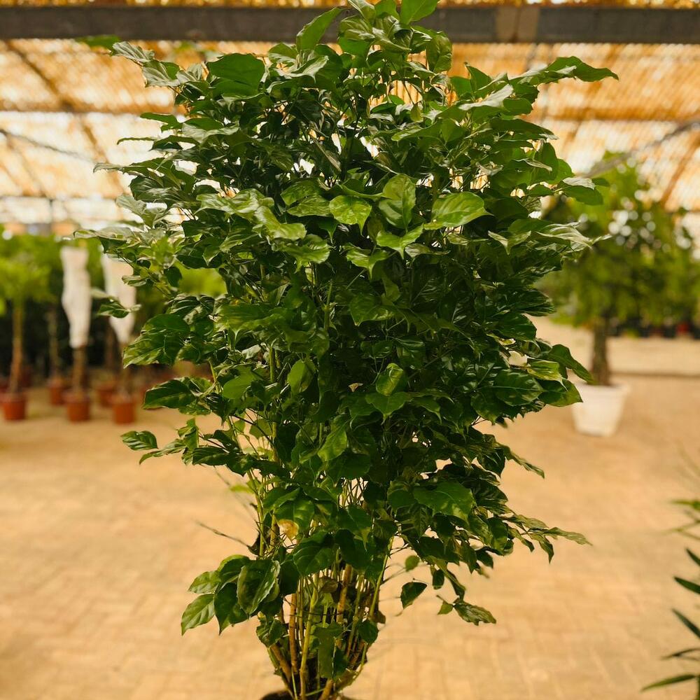 La plante se caractérise par son feuillage dense, composé de nombreuses feuilles vertes brillantes, petites à moyennes, qui lui donnent un aspect plein et touffu.