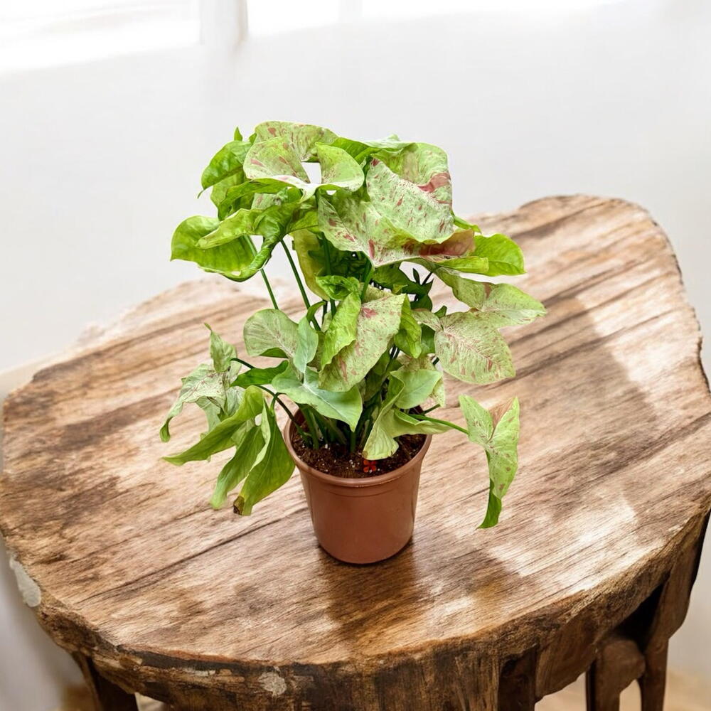 Syngonium Confetti, également connu sous le nom de Milk Confetti ou Arrowhead Vine, est une plante d'intérieur aroïde prisée pour ses feuilles vert clair panachées de rose et de crème.