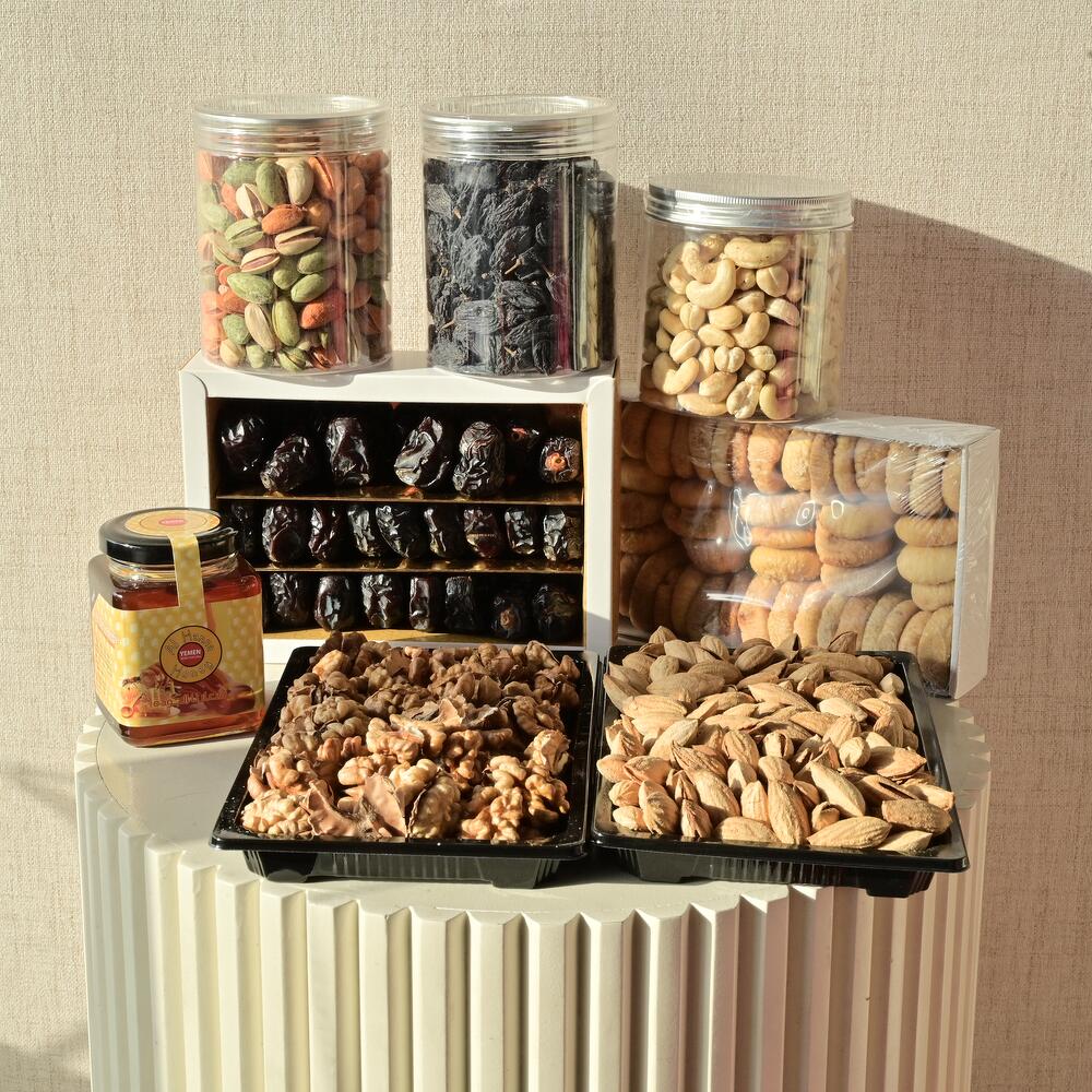 Ce panier soigneusement sélectionné est rempli d'une variété de fruits secs et de noix de qualité supérieure, notamment des amandes grillées, un mélange de pistaches, des raisins secs, des noix de cajou, des noix, des figues et du miel. Complété par la touche sucrée des dattes Ajwa, ce panier est conçu pour nourrir et ravir. Magnifiquement agencé avec des roses roses, des matthiolas blanches et des astilbes roses, c'est le cadeau parfait pour partager la santé et le bonheur pendant ce mois béni.