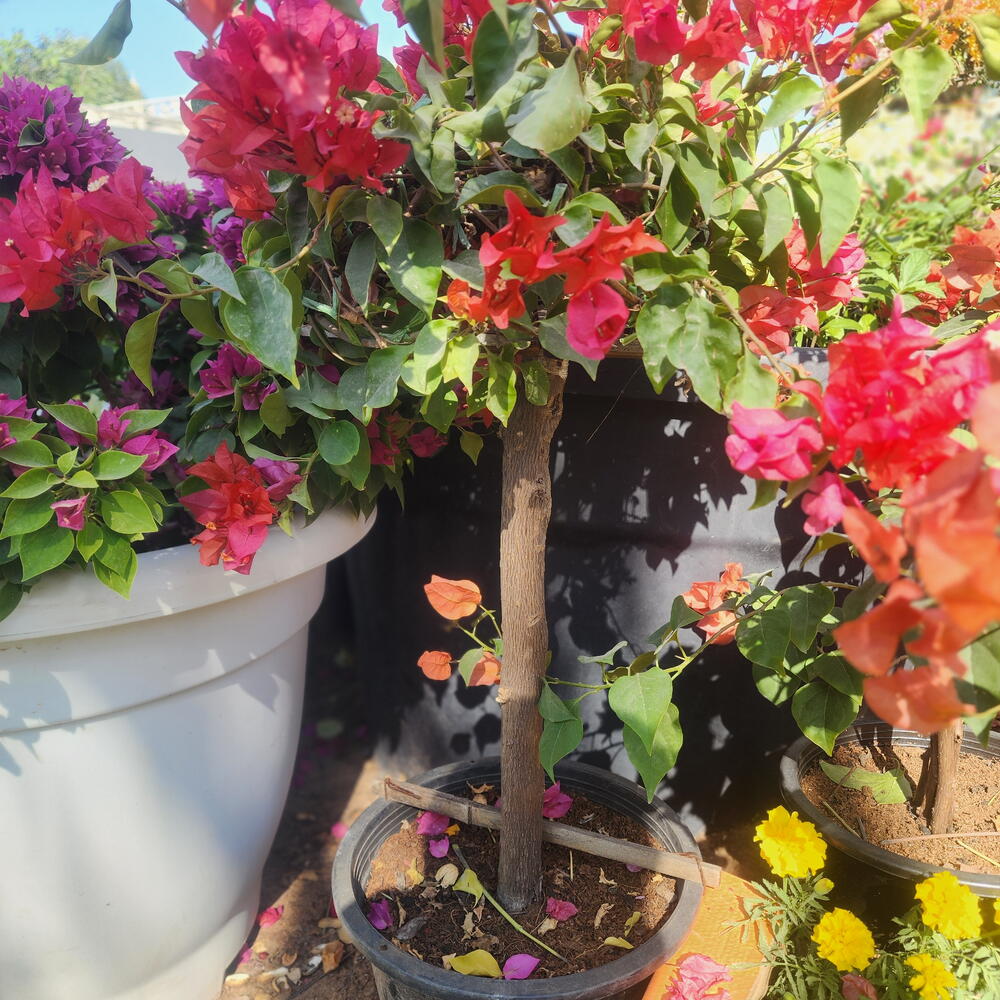 The plant in the image is a bougainvillea. Proper care involves specific conditions to ensure vibrant blooms and healthy growth. Sunlight: Bougainvillea thrives in full sun and requires a minimum of 6 hours of direct sunlight daily for optimal growth and flowering. More sun generally results in more blooms. Watering: Once established, water the plant deeply but infrequently, allowing the top inch or so of the soil to dry out between waterings. Overwatering or constantly wet soil can lead to root rot and inhibit blooming. Soil: The plant prefers well-draining, slightly acidic soil (pH 5.5–6.0). If planting in a pot, a terracotta container can help prevent the soil from staying too wet. Temperature: As tropical plants, bougainvilleas prefer warmer climates and should be protected from frost. Established plants can survive occasional cold snaps, but they thrive in hardiness zones 9 and above.