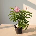 The Desert Rose, scientifically known as Adenium Obesum, is a succulent plant that is native to the arid regions of Africa and Arabia. It is a small tree or shrub that can grow up to 30-60cm in height and has a thick, swollen stem that stores water. The stem is usually grey or brown in color and has a rough, scaly texture. The leaves of the Desert Rose are glossy and dark green, and they grow in clusters at the end of the branches. The leaves are oval-shaped and can grow up to 15cm in length. The plant produces beautiful, trumpet-shaped flowers that are usually pink or red in color, but can also be white or yellow. The flowers have a distinctive five-petal shape and a sweet fragrance. The Desert Rose is a popular ornamental plant that is often grown in pots or containers. It is a hardy plant that can tolerate drought and heat, making it an ideal choice for gardens in hot climates.