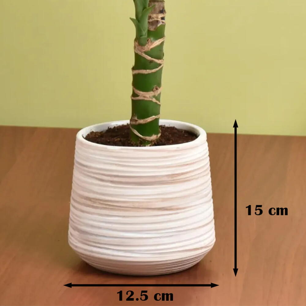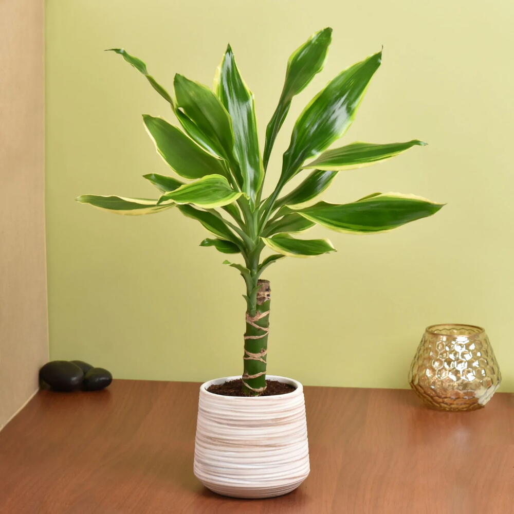 Dracaena Plant Planted in a White Pot With Wooden Stand Dracaena Plants are among the most Effective Houseplants for Removing Pollutants from a Home's air. Dracaena prefers bright, indirect light Pot Dimension: Diameter - 12 CM, Height 17 CM(With Stand 17 CM)