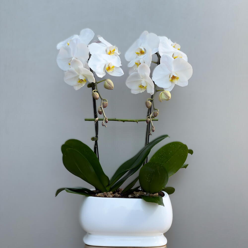 Elegant and timeless, the Graceful Orchid Duo showcases two stunning white Phalaenopsis stems, thoughtfully arranged in a refined ceramic pot. With their cascading blooms and delicate charm, these orchids are more than just flowers—they are a symbol of purity, refinement, and enduring beauty. Whether as a sophisticated gift or a minimalist accent for your space, this arrangement brings a serene, luxurious presence to any room. Perfect for birthdays, housewarmings, or simply to express grace and admiration. ✅ Call-to-Action Add a touch of effortless elegance to someone’s day. Order the Graceful Orchid Duo now—because timeless beauty never goes out of style.