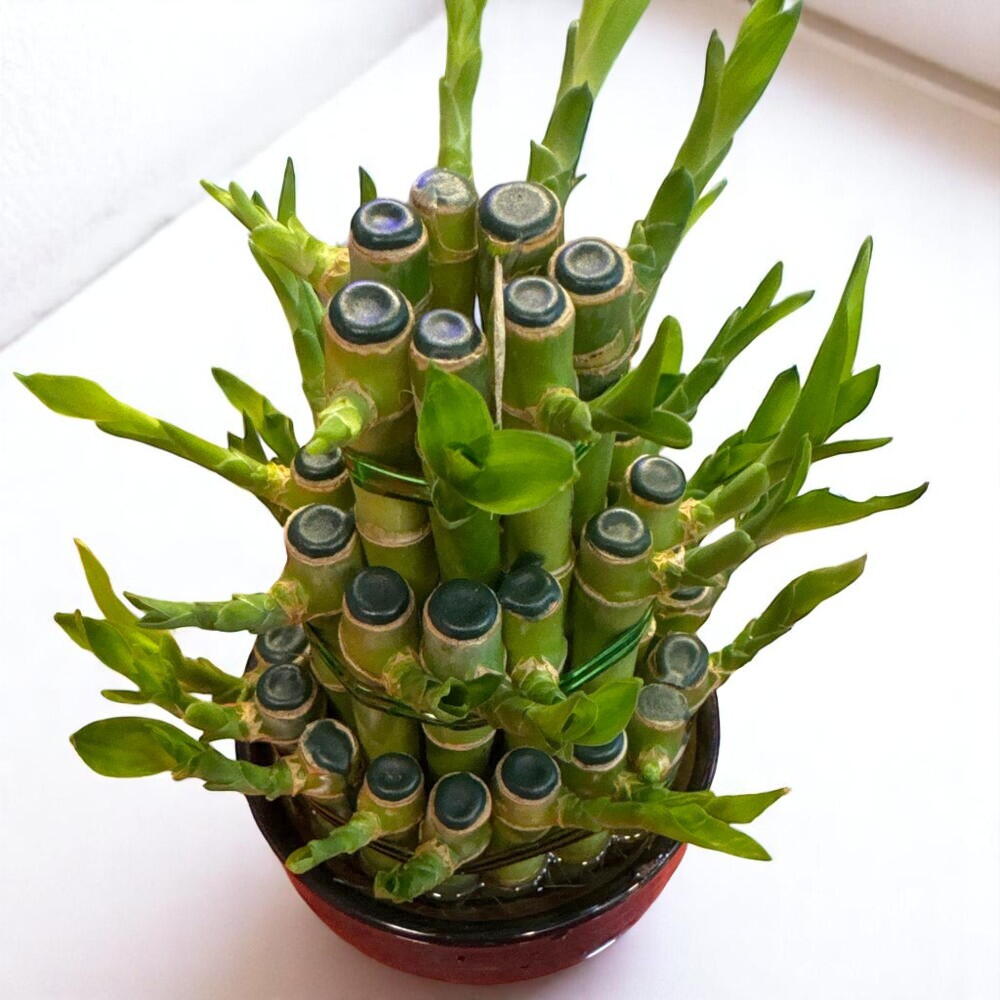 Place in a bright room with indirect sunlight. Use clean, filtered water and refresh it every two weeks to keep the bamboo healthy and vibrant. Avoid direct sun exposure to prevent leaf scorching. Maintain water level just above the roots at all times.