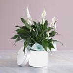 Plant Name - Spathiphyllum, Plant Type - Air Purifying Plant, Plant Placement - Indoor, Decoration - Natural Soil, Wrapped in Sky Blue Wrapping, Arranged in a Round White Box.
