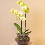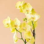 Golden Bloom A vibrant Yellow Phalaenopsis orchid(Phalaenopsis amabilis) elegantly arranged in a clear glass vase.