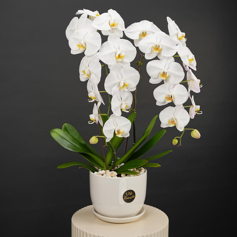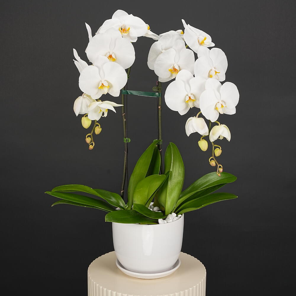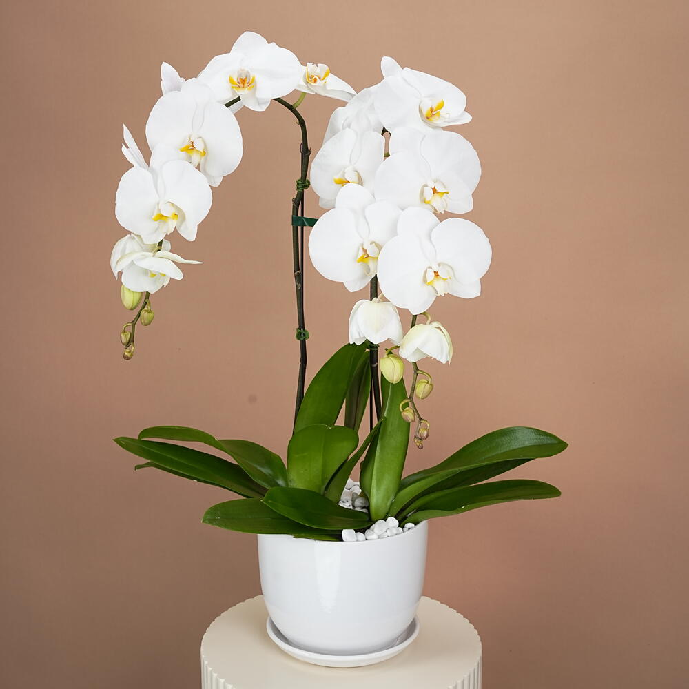 2 stems of white Phalaenopsis orchid plant in a nice white pot