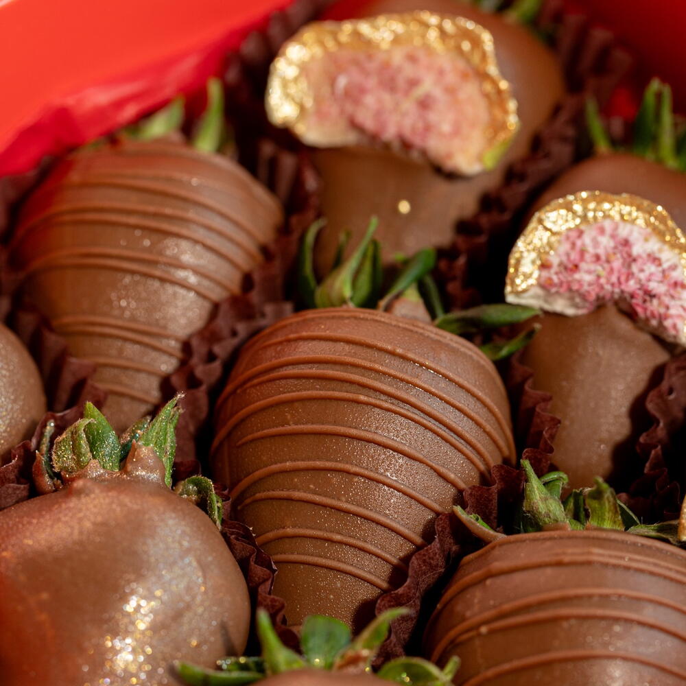 3 клубники в бельгийском молочном шоколаде с золотым блеском 3 клубники в бельгийском молочном шоколаде с шоколадными полосками 3 клубники в бельгийском молочном шоколаде с лиофилизированными инжирами