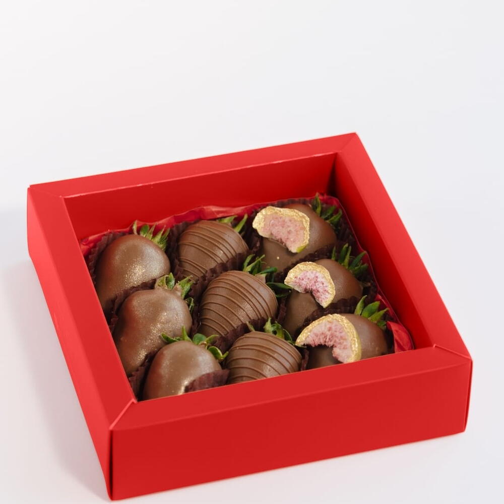 В коробке Sara Box — клубника в бельгийском молочном шоколаде, сверху инжир, шоколадные подтеки и золотое сияние. Непринужденная изысканность в каждом укусе.