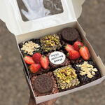Это ассорти шоколадных брауни с нутеллой, молочно-шоколадно-фисташковой кремовой поливкой на брауни, с клубникой, печеньем Oreo, фундуком и фисташками в качестве топпинга, чтобы сделать брауни более элегантными