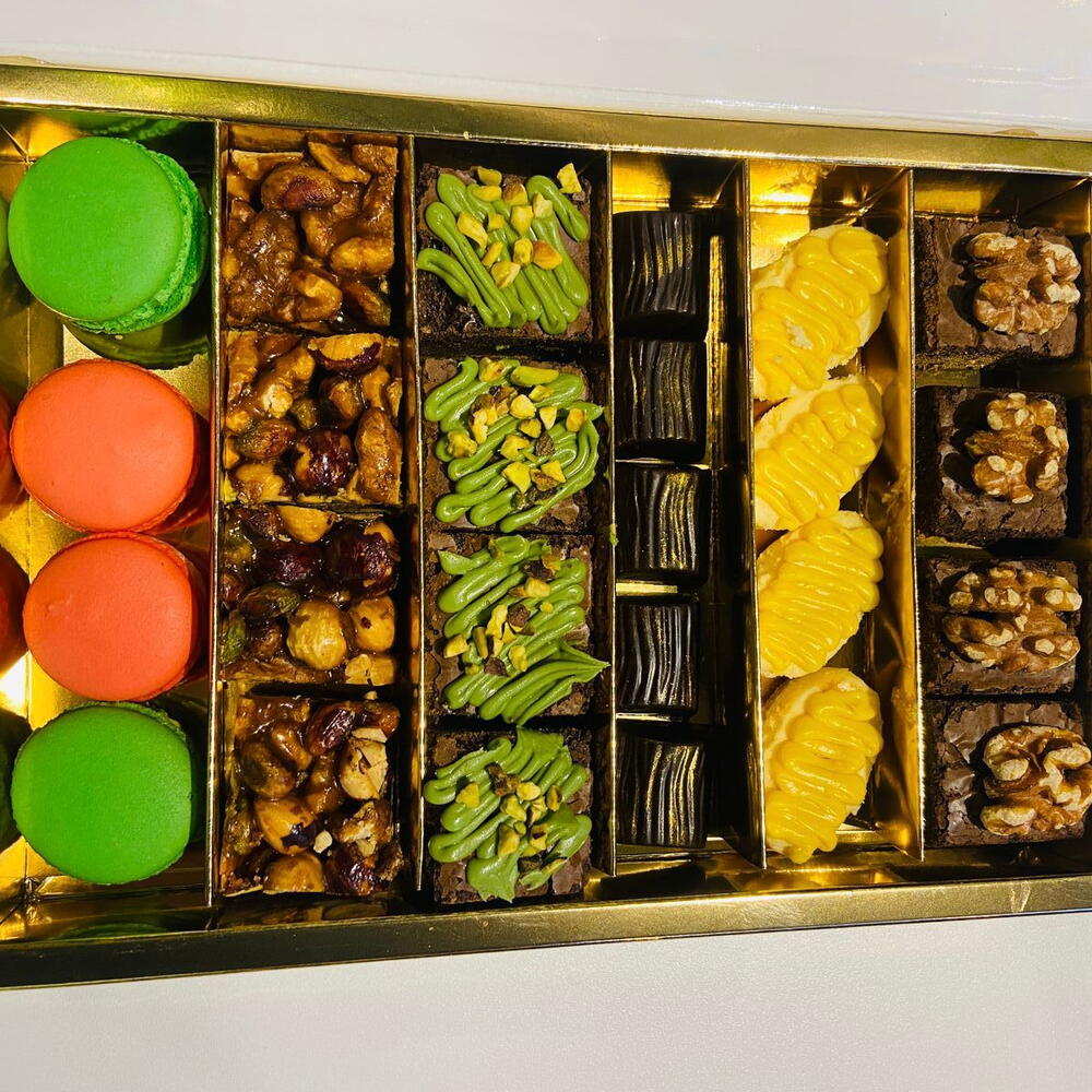 24 шт. мини-ассорти петит-фур. (8 шт. брауни, 4 шт. шоколадных кусочков и 4 шт. ореховых кусочков)