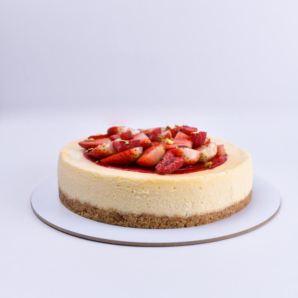 Хрустящая основа из печенья , Смесь запечённого сливочного сыра , Ягодный конфит , Свежие ягоды