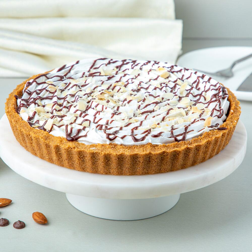 Корж из печенья, наполненный ломтиками банана и вкусной ирисной начинкой, сверху взбитые сливки, шоколадный фадж и жареный миндаль. 8 дюймов для 6-8 человек,