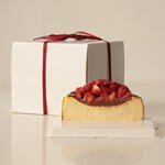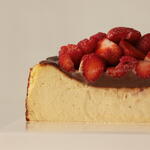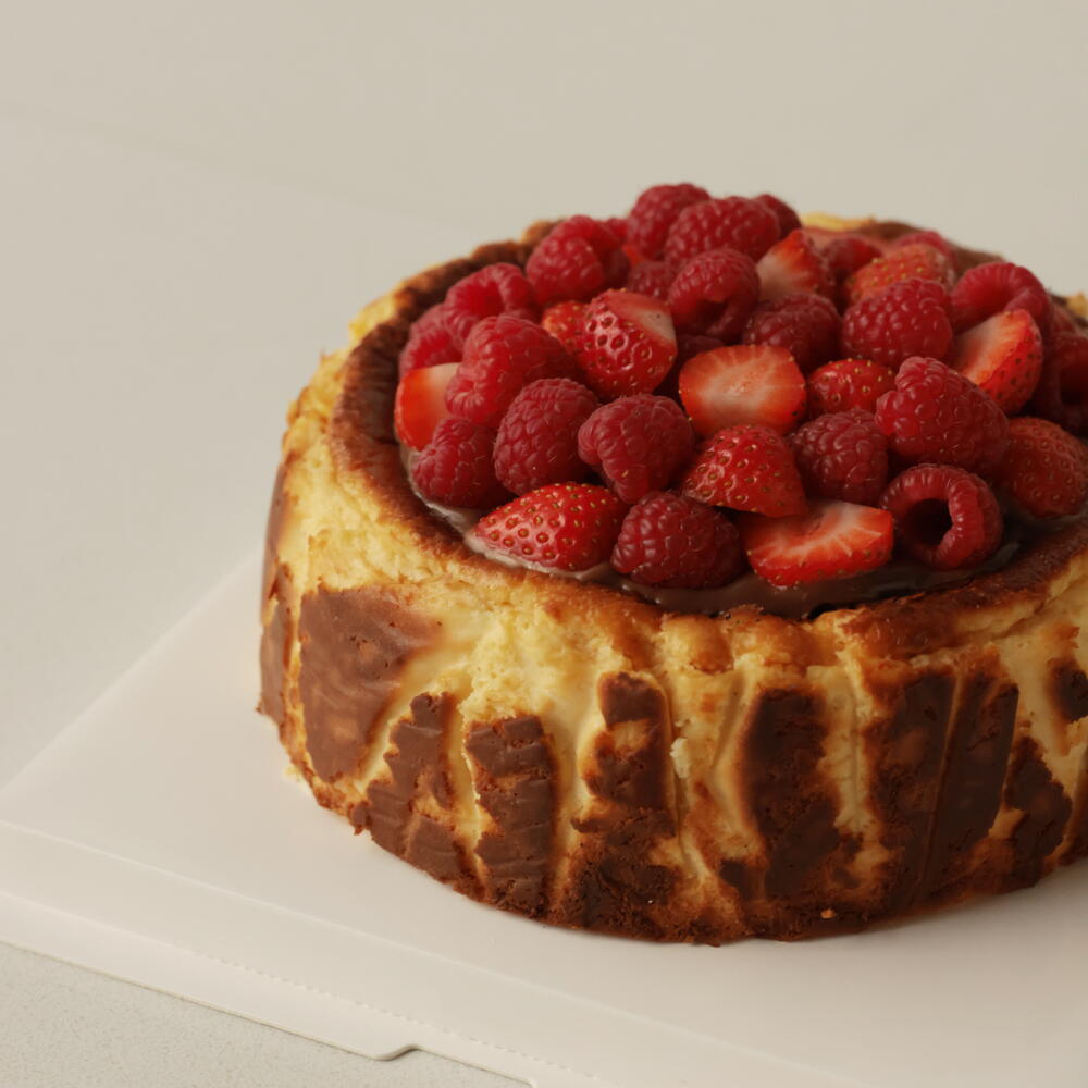 An incredibly delicate cheesecake infused with natural vanilla, topped with milk chocolate ganache and a generous mix of fresh berries (raspberries and strawberries).