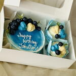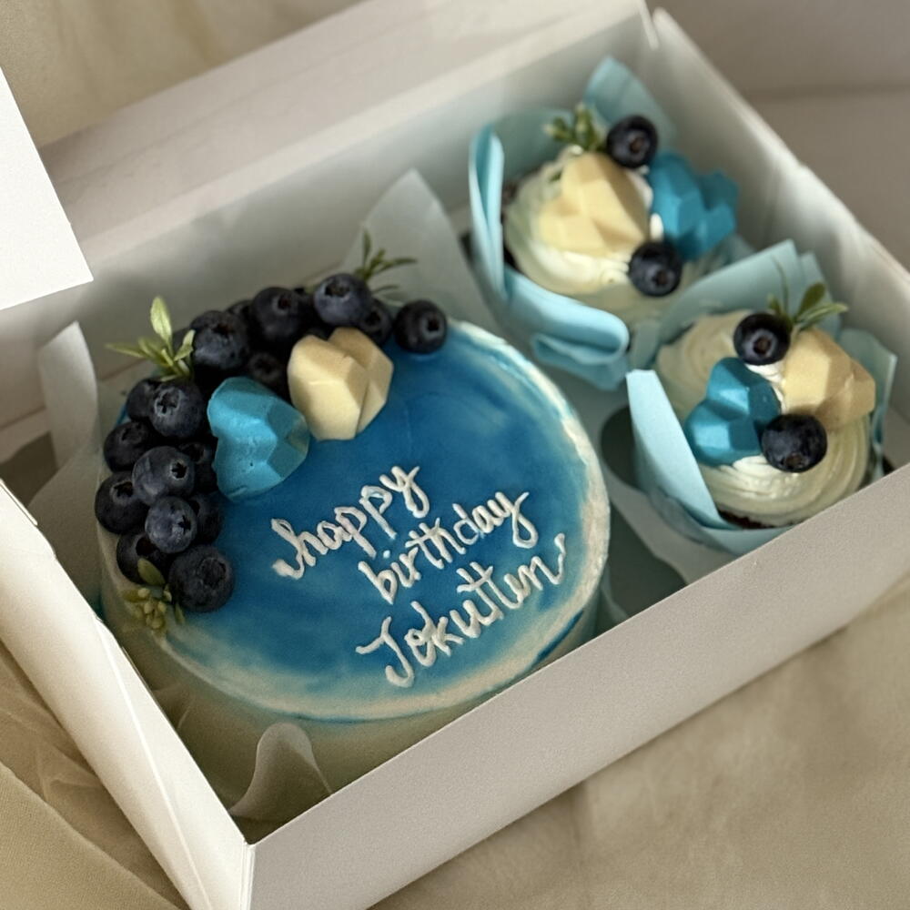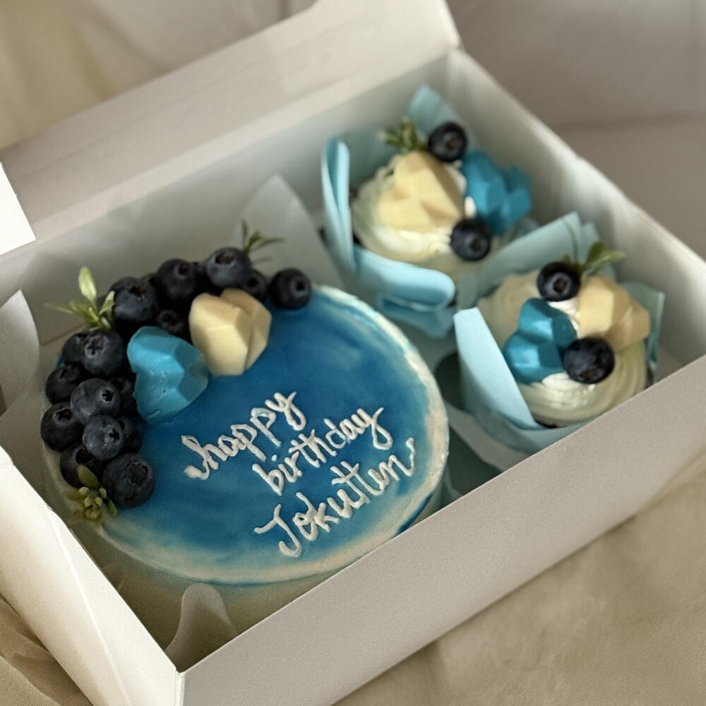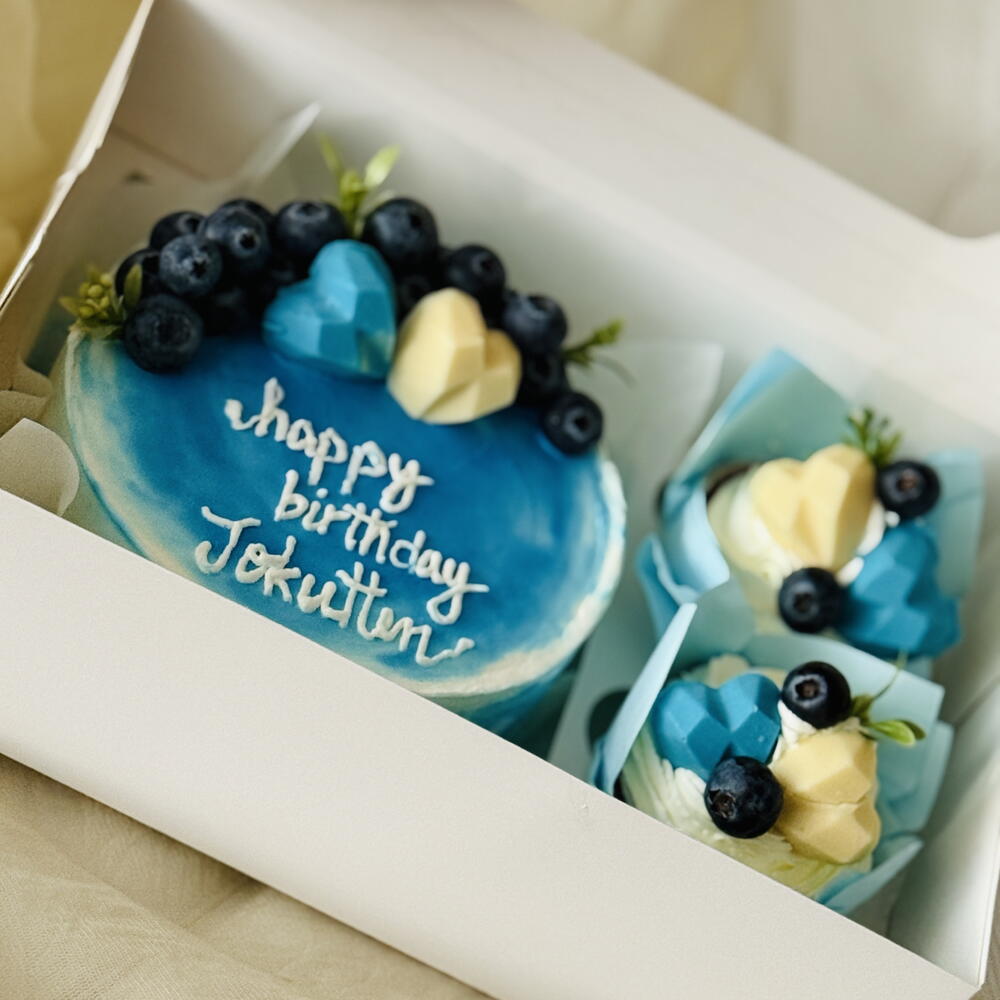 🔥 Черничный торт! Итак, суть такова: это круглый торт с омбре сверху в синем и белом. На торте милой белой глазурью написано happy birthday Jokuten. Сверху у торта много сочных ягод черники и два шоколадных сердечка - одно синее и одно жёлтое. Выглядит очень вкусно и празднично для дня рождения Джокутена! 🍰💙
