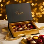 A refined selection of 12 artisan chocolates, crafted to delight every palate. This elegant box features a harmonious blend of flavors including almond, hazelnut, pistachio, strawberry, and orange, each piece offering a unique balance of rich chocolate and delicate fillings. Perfect for gifting or savoring a luxurious sweet moment.