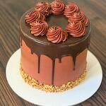 Премиальный шоколадный торт с влажным шоколадным бисквитом и шоколадным кремом, пропитанным ганашем. Завершено шоколадным кремом и ганашом. Бока покрыты ореховой крошкой.