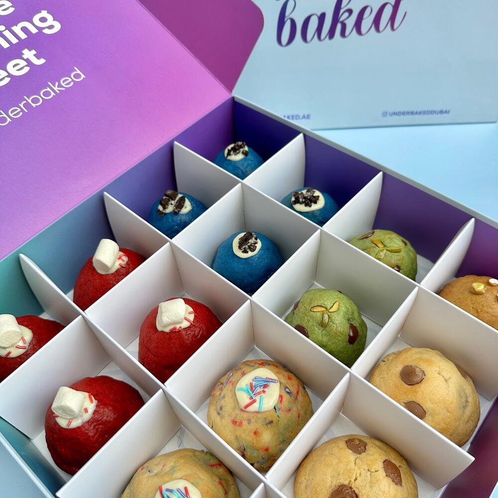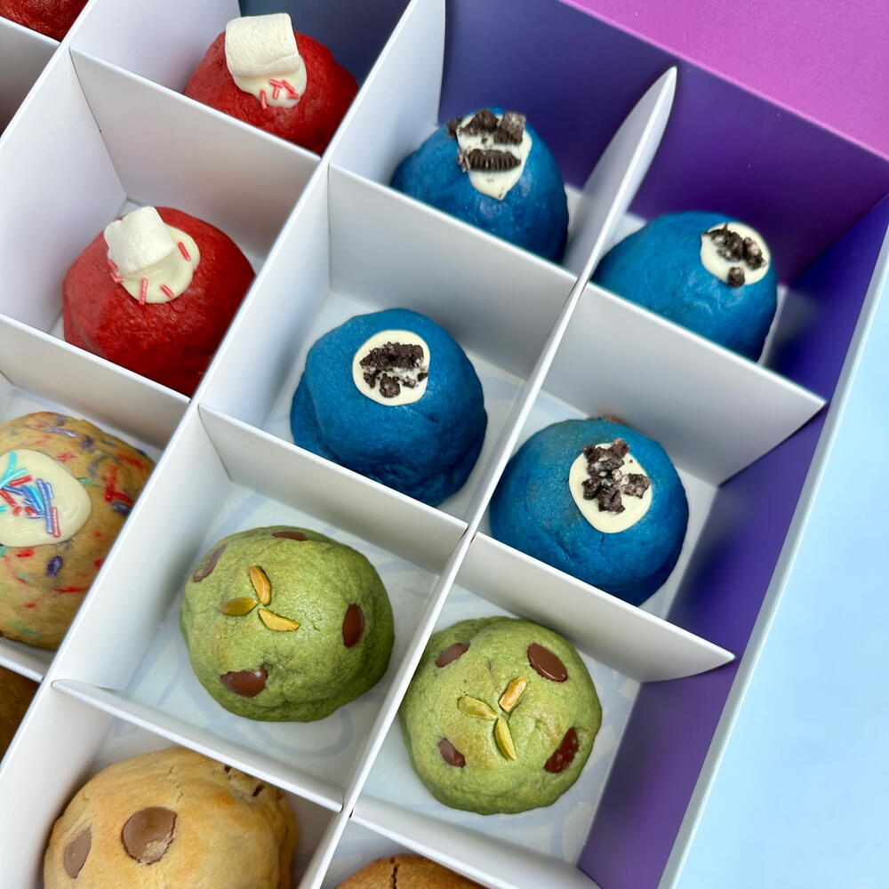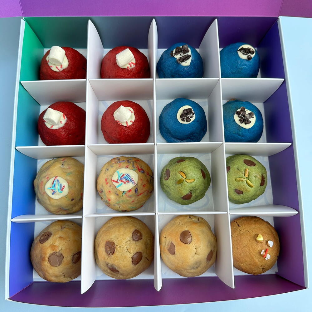 Коробка из 16 маленьких печенек с разными начинками. В коробке 4 из наших самых продаваемых вкусов: - Loco for choco (Nutella) - Pistach’io yeah - The Red One (Red Velvet) - Cookie Monster (Oreo) - Ruby (клубника) - Lotus Lover - Party Animal (белый шоколад/сливочный сыр)