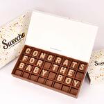 Бренд - Sweecho, Текст - Поздравления с рождением мальчика, Тип - Молочный шоколад, Количество - 32 шт., Мраморные шоколадные буквы, Разные вкусы - Фисташки, Чизкейк, Лотос, Фундук, Кофе, Кукурузные хлопья, Смесь орехов и рисовых чипсов, Аллергены - Орехи и молоко, Упаковано в красивую подарочную коробку.