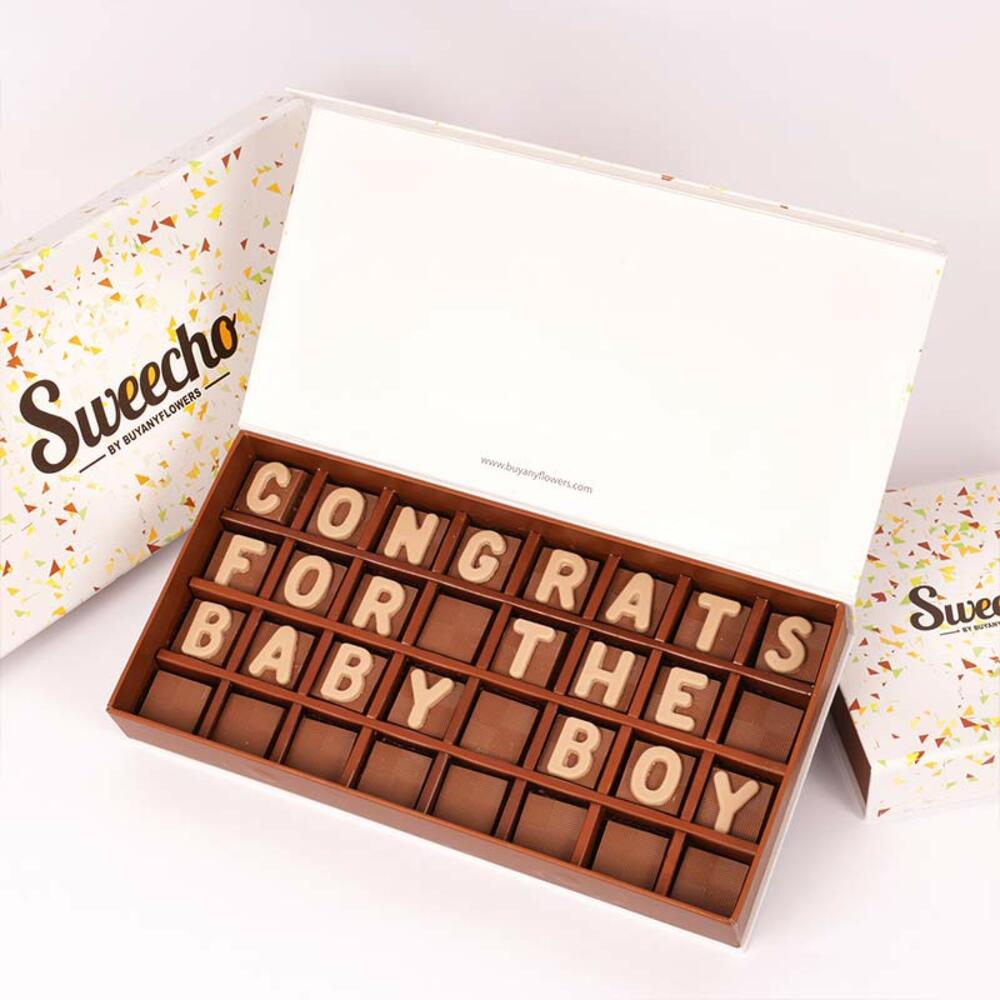 Бренд - Sweecho, Текст - Поздравления с рождением мальчика, Тип - Молочный шоколад, Количество - 32 шт., Мраморные шоколадные буквы, Разные вкусы - Фисташки, Чизкейк, Лотос, Фундук, Кофе, Кукурузные хлопья, Смесь орехов и рисовых чипсов, Аллергены - Орехи и молоко, Упаковано в красивую подарочную коробку.