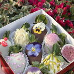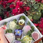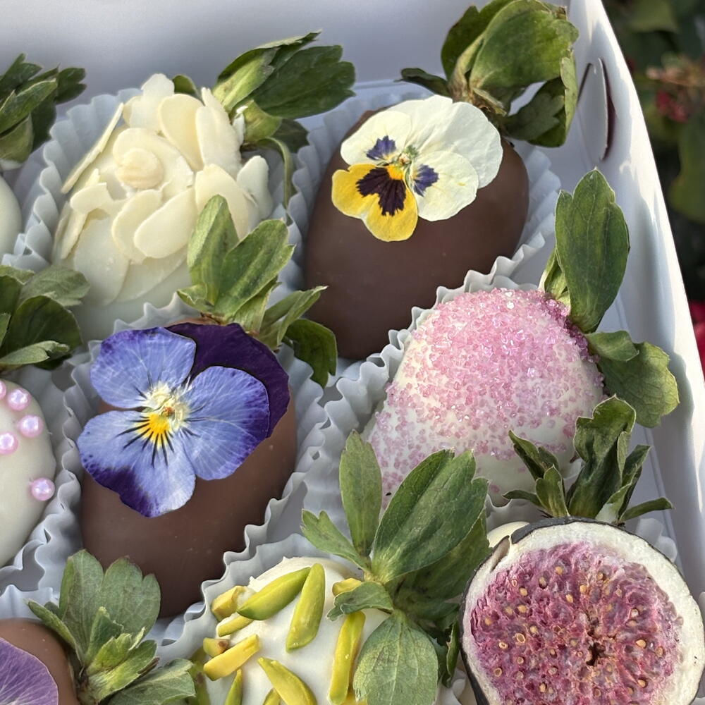 Свежая клубника, молочный шоколад, белый шоколад, съедобные цветы фиалки (анютины глазки), миндаль, фисташки, сахарные жемчужины, натуральный пищевой краситель. ⸻ Информация об аллергенах Содержит молоко и орехи. Может содержать следы других орехов. ⸻ Дополнительная информация • Изготовлено вручную и свежим на заказ • Съедобные цветы сезонные и могут незначительно отличаться по цвету • Лучше всего употребить в день доставки